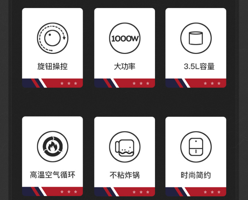 产品名称:空气炸锅 额定频率:50Hz 净重/毛重:3.2/3.8kg 产品型号MC-KL355 额定功率:1000W 产品尺寸325*245*308mm 额定电压:220V~ 炸篮容量:3.5L