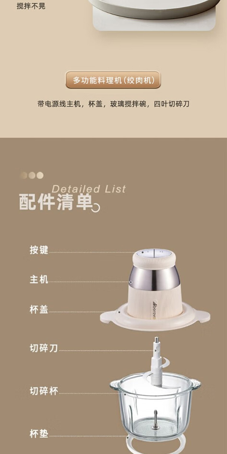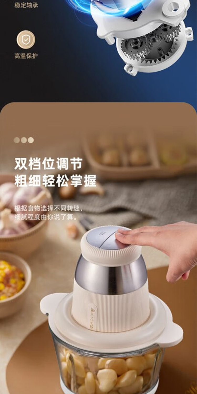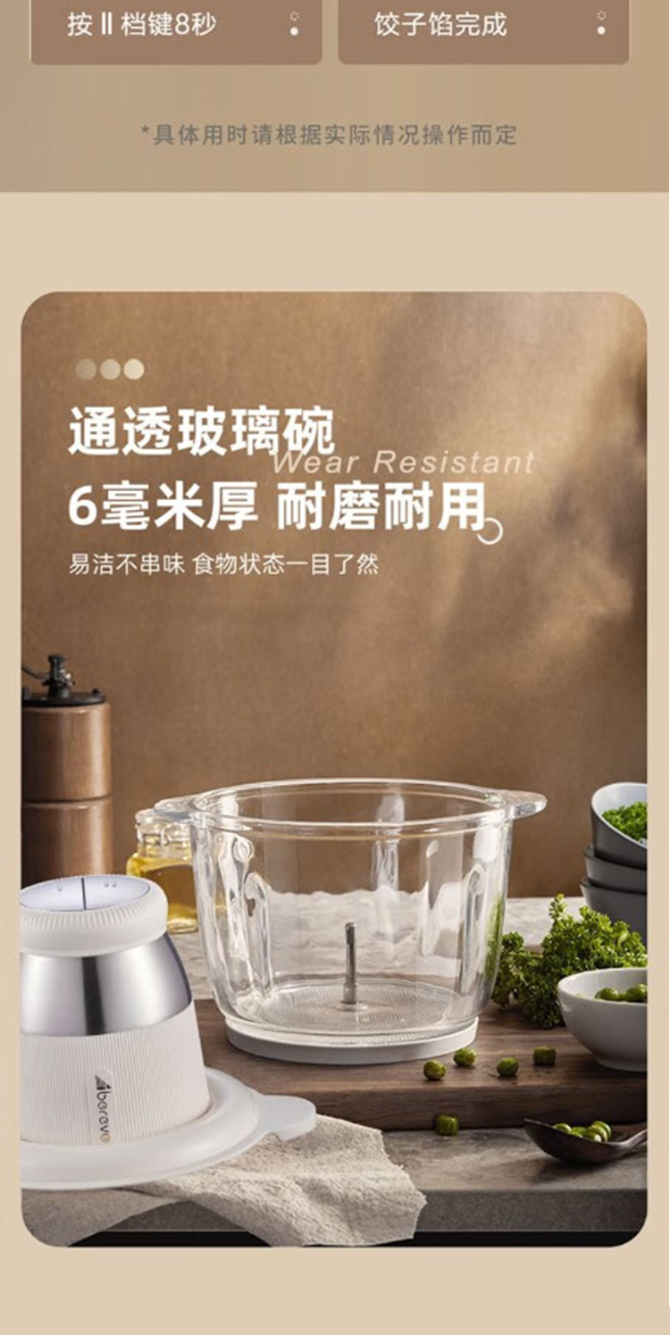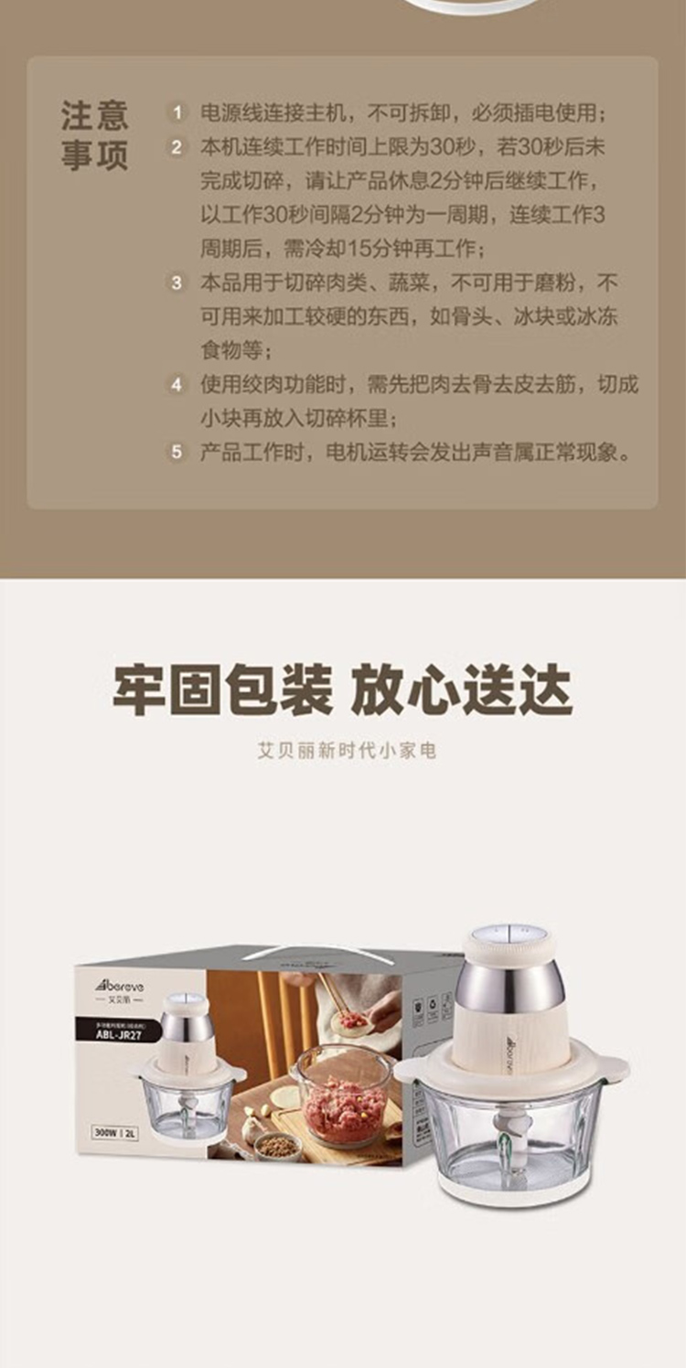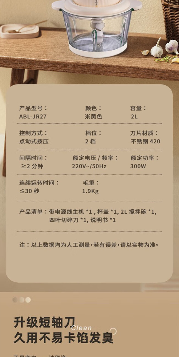 产品型号:ABL-JR27 控制方式:点动式按压 间隔时间:≥2 分钟 颜色:米黄色 容量:2L 档位:2档 刀片材质:不锈钢420 额定功率:300W 毛重:1.9kg 产品清单:带电源线主机*1,杯盖*1,2L搅拌碗*1,四叶切碎刀*1,说明书*1