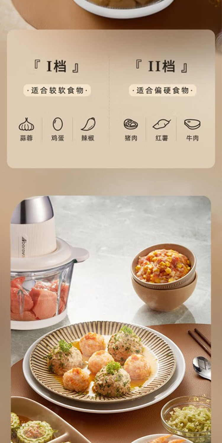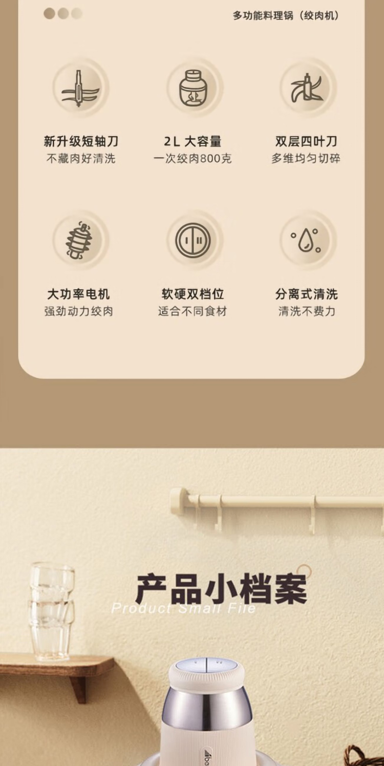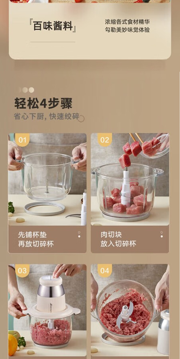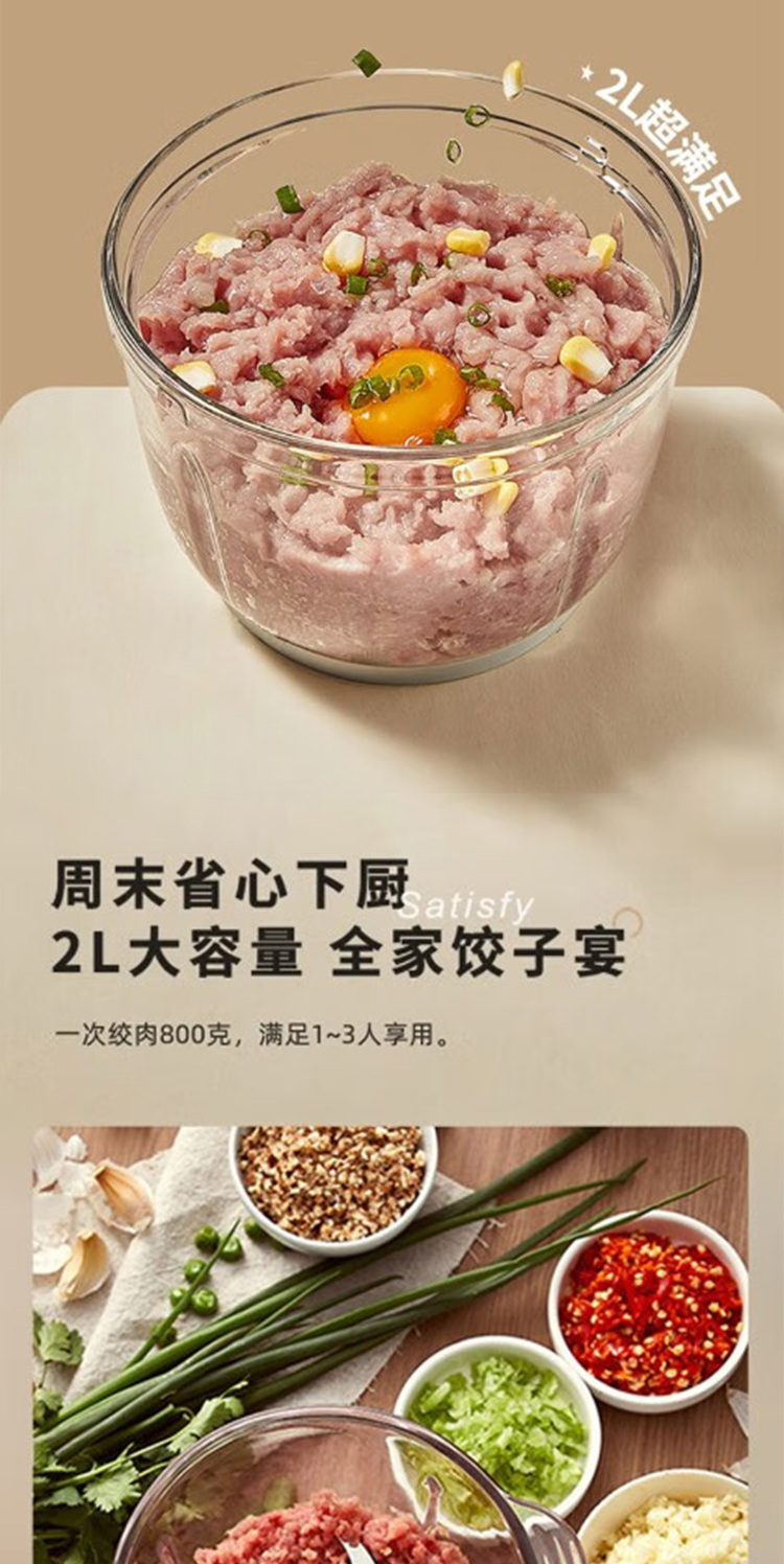 产品型号:ABL-JR27 控制方式:点动式按压 间隔时间:≥2 分钟 颜色:米黄色 容量:2L 档位:2档 刀片材质:不锈钢420 额定功率:300W 毛重:1.9kg 产品清单:带电源线主机*1,杯盖*1,2L搅拌碗*1,四叶切碎刀*1,说明书*1