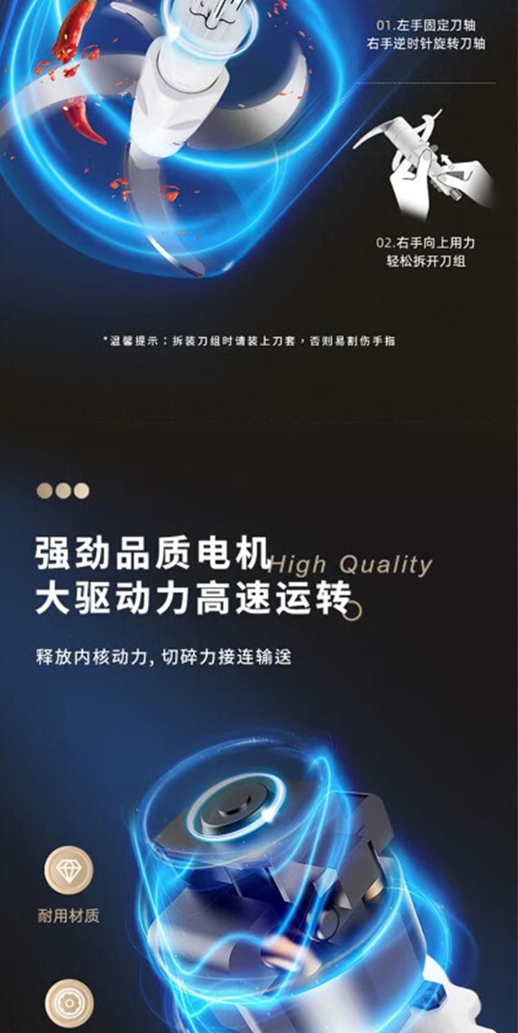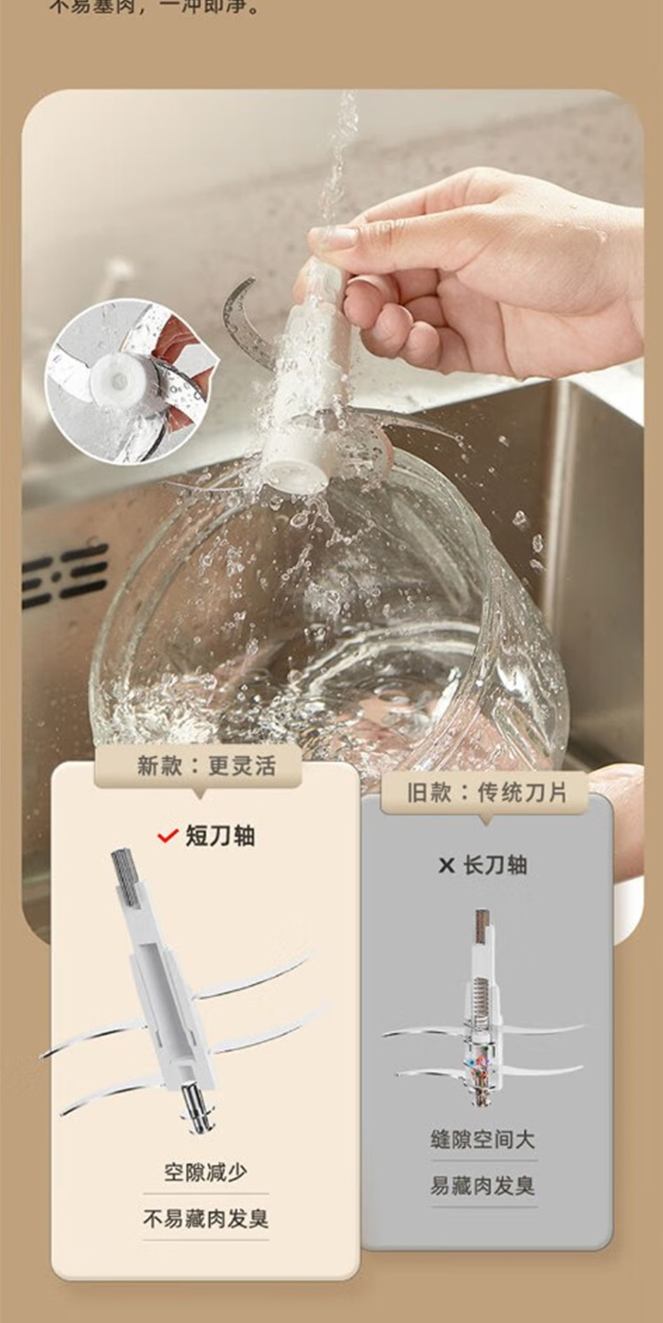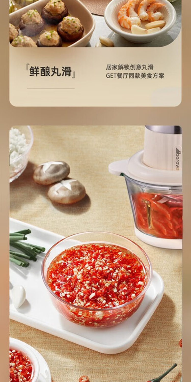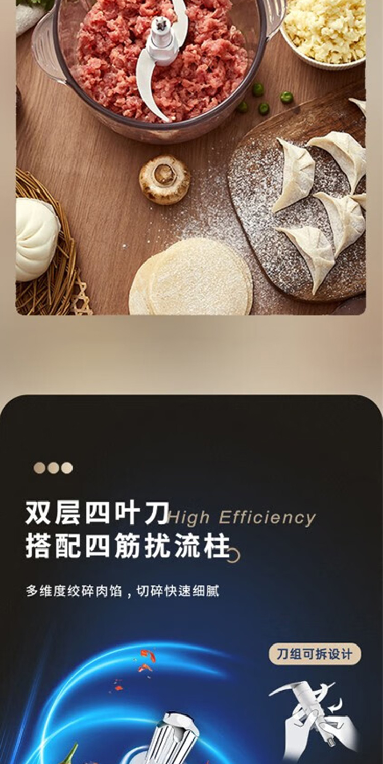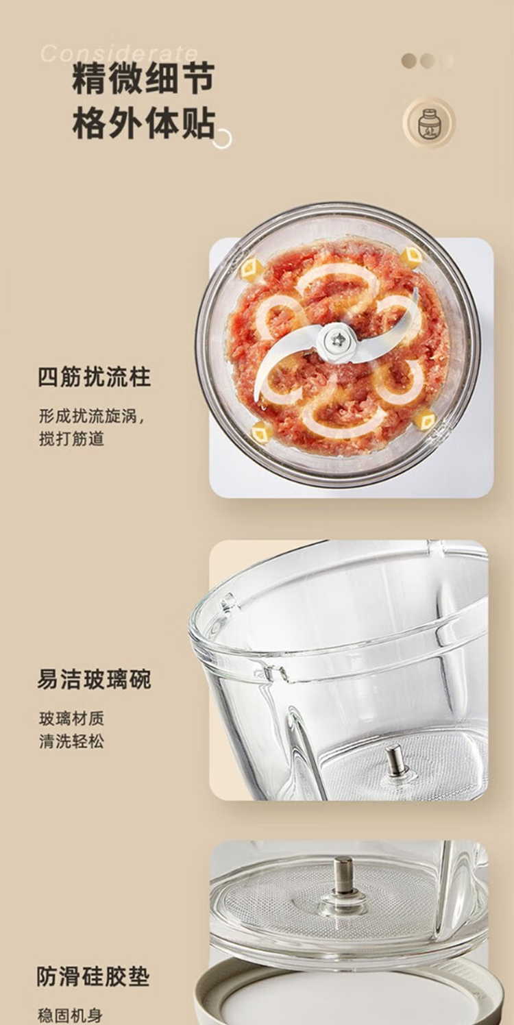 产品型号:ABL-JR27 控制方式:点动式按压 间隔时间:≥2 分钟 颜色:米黄色 容量:2L 档位:2档 刀片材质:不锈钢420 额定功率:300W 毛重:1.9kg 产品清单:带电源线主机*1,杯盖*1,2L搅拌碗*1,四叶切碎刀*1,说明书*1